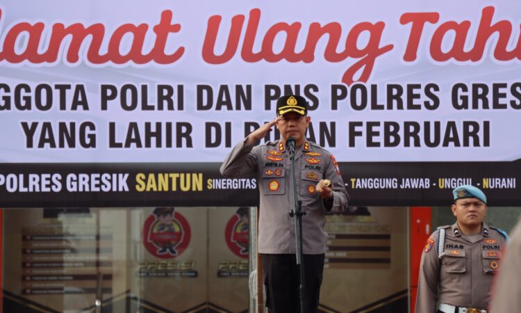 Jurnalis Info.net, Gresik – Kapolres Gresik AKBP Adhitya Panji Anom memimpin apel pagi anggota Polres Gresik yang bersamaan dengan anggota berulang tahun pada bulan Pebruari 2023. Seluruh jajaran diminta menjaga Kamtibmas.