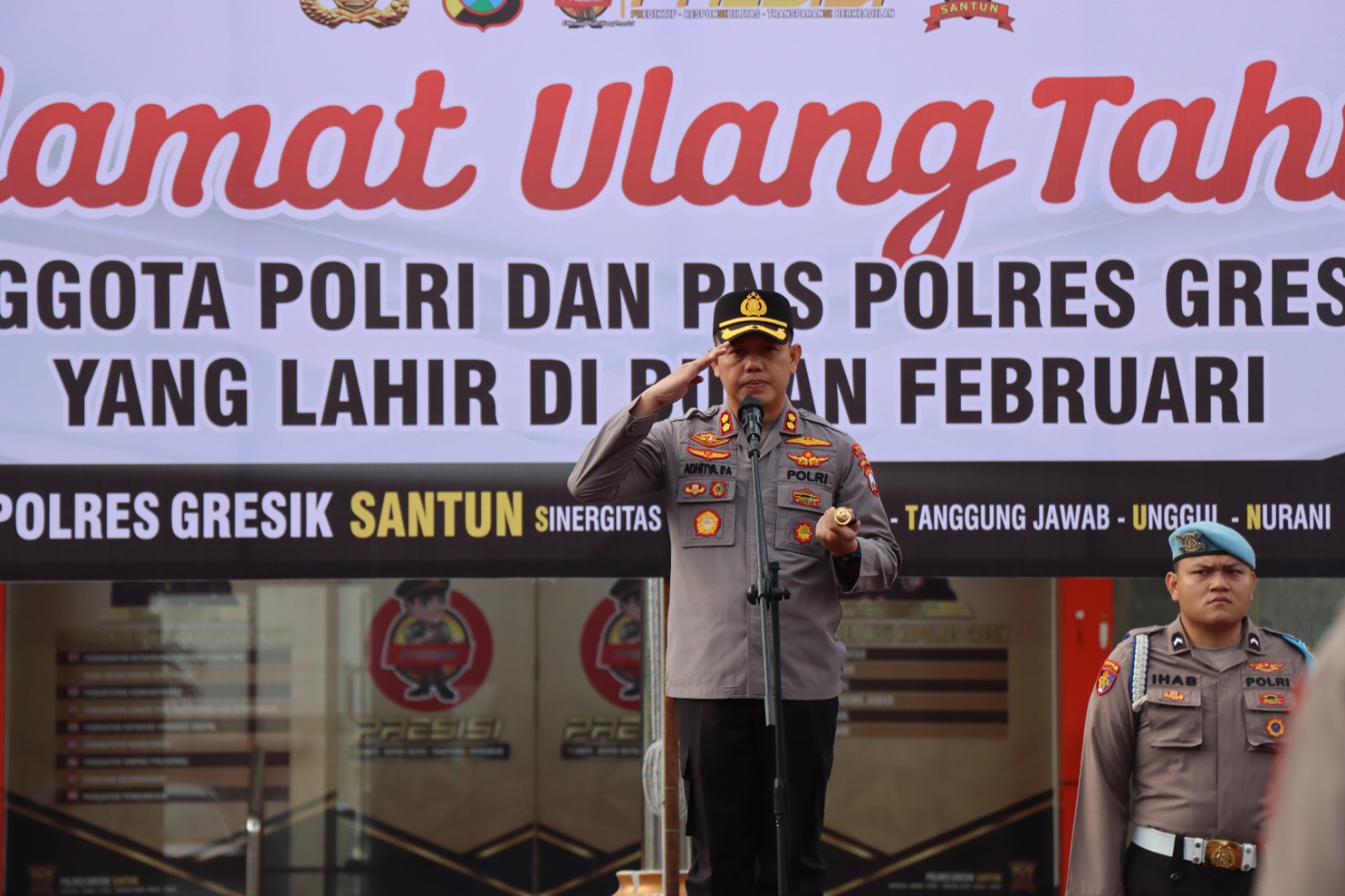 “Selamat ulang tahun Gresik semoga diberikan umur panjang, bermanfaat bagi masyarakat, kesehatan, keselamatan dunia dan akhirat,” ucap AKBP Adhitya saat membuka apel.