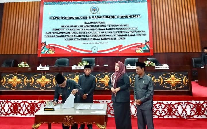 Sesi akhir Paripurna ini dilakukan penandatanganan nota kesepakatan rancangan awal RPJMD Kabupaten Murung Raya tahun 2025-2029 antara pihak eksekutif dan legislatif.