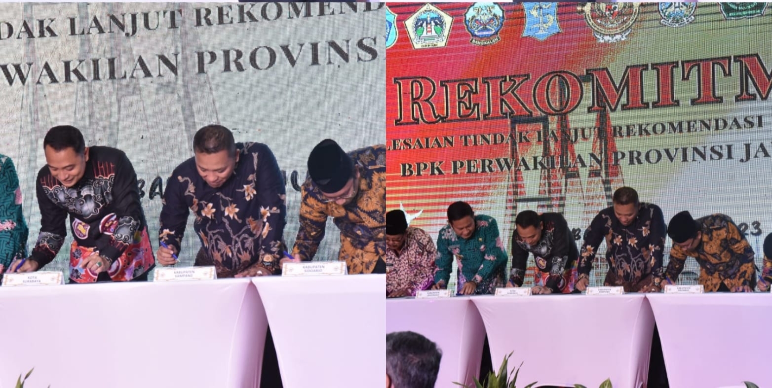 Sidoarjo, Jurnalisinfo.net – Enam Kepala Daerah di Jawa Timur menandatangani rekomitmen penyelesaian Tindak Lanjut Rekomendasi Hasil Pemeriksaan (TLRHP) BPK Jawa Timur. Salah satunya Bupati Sidoarjo H. Ahmad Muhdlor S.IP.