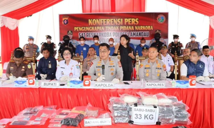 Lebih lanjut, Kapolda juga menerangkan bahwa kelima pelaku yang berhasil diamankan tersebut, diantaranya HM dan YL dengan barang bukti 33 paket platik bungkus berisi sabu dengan total berat sebanyak 33,6 Kilogram.