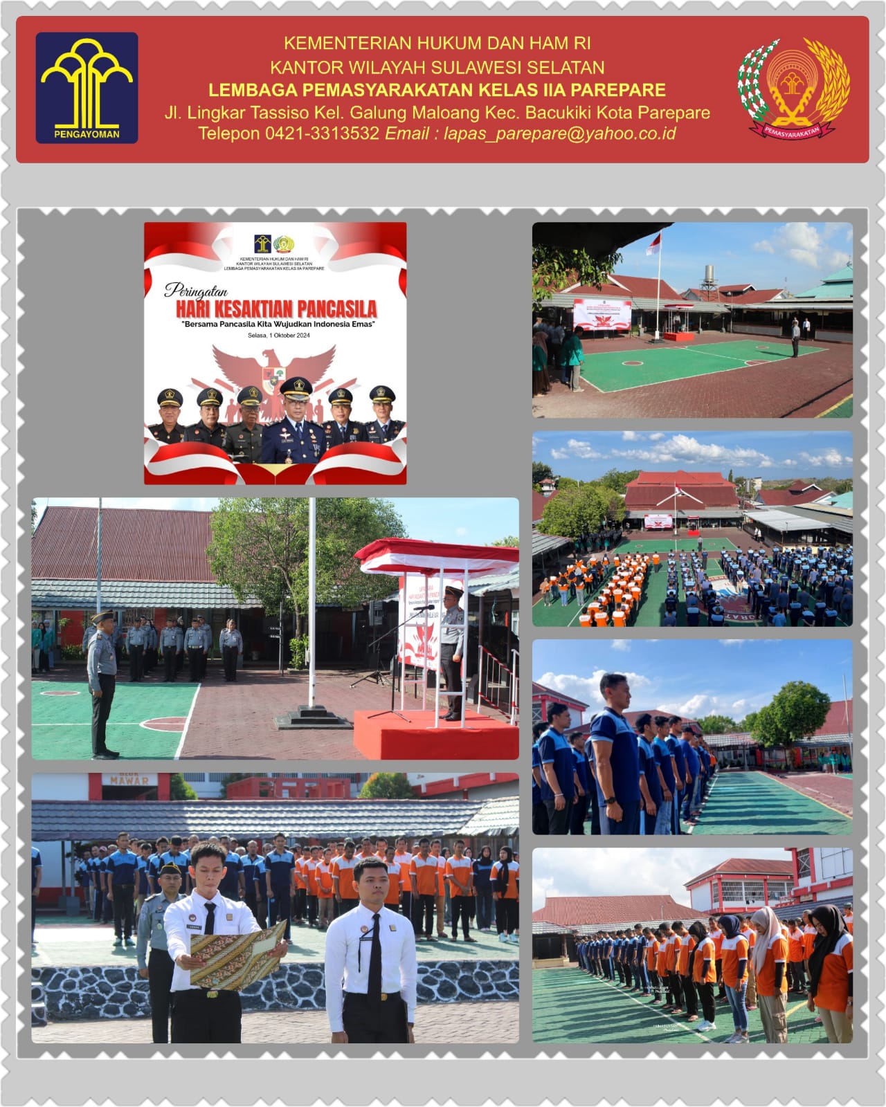 Jurnalisinfo.net , Parepare, 01 Oktober 2024. Bertempat di Lapas IIA Parepare telah dilaksanakan Upacara Peringatan Hari Kesaktian Pancasila Tahun 2024 di lingkungan Kementerian Hukum dan Hak Asasi Manusia RI, Selasa, 01 Oktober 2024.