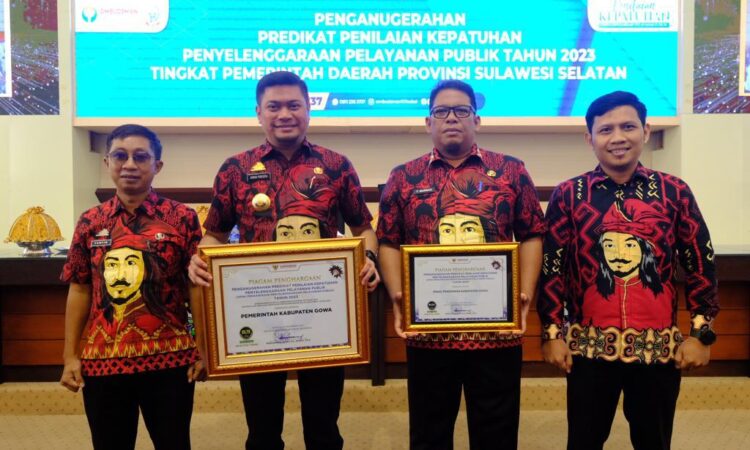 GOWA | JURNALIS INFO—- Pemerintah Kabupaten Gowa meraih penghargaan terbaik ketiga Penyelenggaraan Pelayanan Publik Tingkat Provinsi Sulawesi Selatan, pada Penganugerahan Predikat Penilaian Kepatuhan Penyelenggaraan Pelayanan Publik Tahun 2023 oleh Ombudsman RI, di Ruang Rapat Pimpinan Gubernur Sulsel, Kamis (25/1).