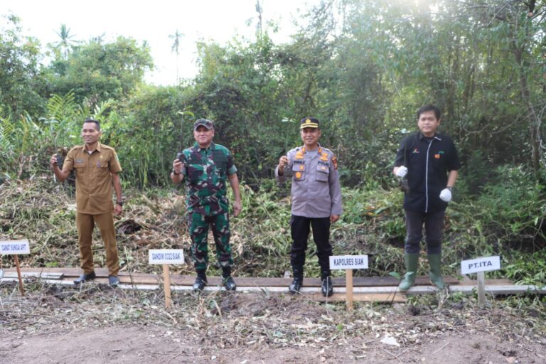 Kapolres bersama Dandim 0322/Siak Letkol Inf Muhammad Faisal Effendi didampingi Pejabat utama Polres Siak dan Kodim 0322/ Siak serta pemerintah Kecamatan Sungai Apit menanam mangrove di sepanjang bibir sungai bersejarah Kampung Kayu ara Kecamatan Sungai Apit, Kabupaten Siak.